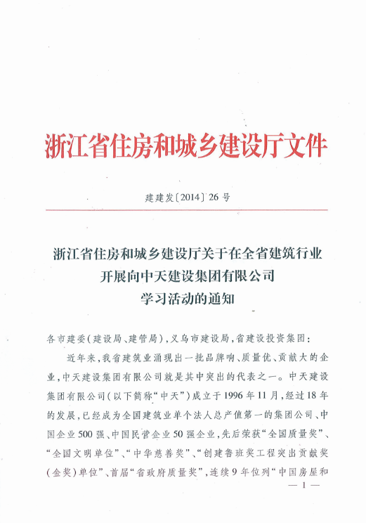 《浙江省住房和城乡建设厅关于在全省建筑行业开展向1277星际电子游戏建设集团有限公司学习活动的通知》